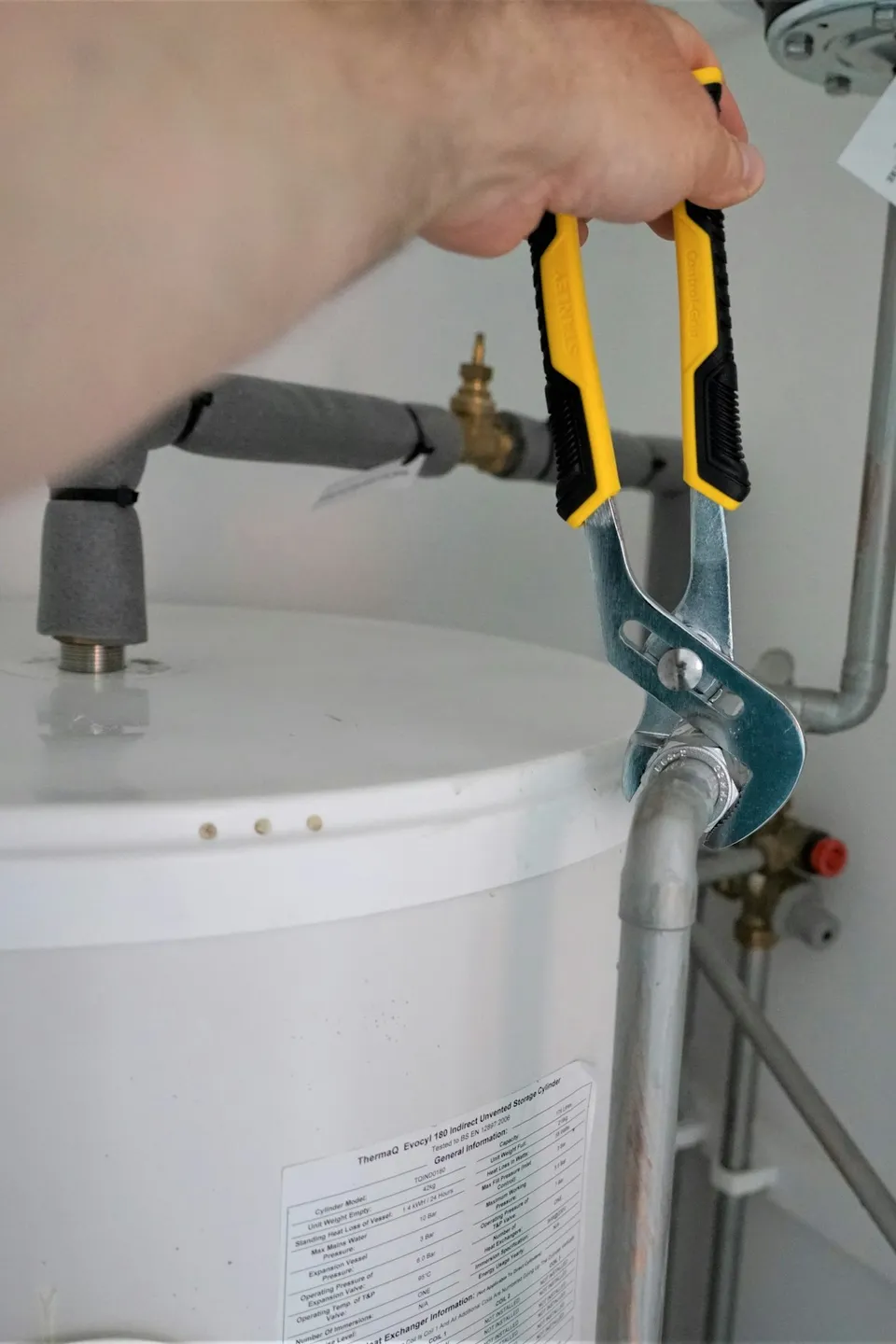 As it turned out, it didn’t take us long at all. A quick look inside the cabinet revealed that there was only one pipe (cold water) under the sink.